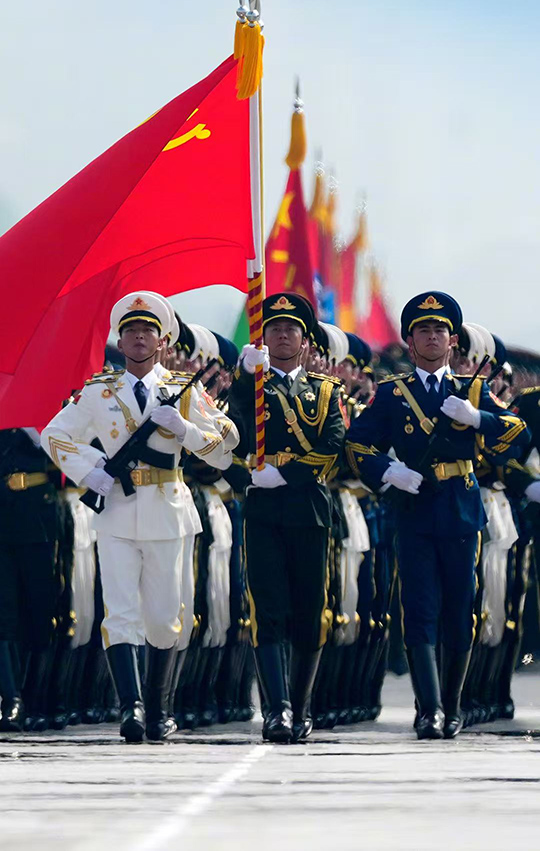 وفي الساعة العاشرة صباحاً، مع بدء العرض العسكري، تم عزف النشيد الوطني الرسمي، ووقف جميع المشاركين بشكل عفوي لإبداء الاحترام. لقد صدمت الخطوات الأنيقة لتشكيلات المشاة والمعدات المتطورة لأعمدة التسليح والمستويات الجوية المهيبة الجميع بشدة، مما يدل على تحسن قوة الدفاع الوطني للصين. كما أن عرض 80 علم شرف لوحدات أبطال الحرب المناهضة لليابان جعل الناس يدركون مدى صعوبة تحقيق النصر.